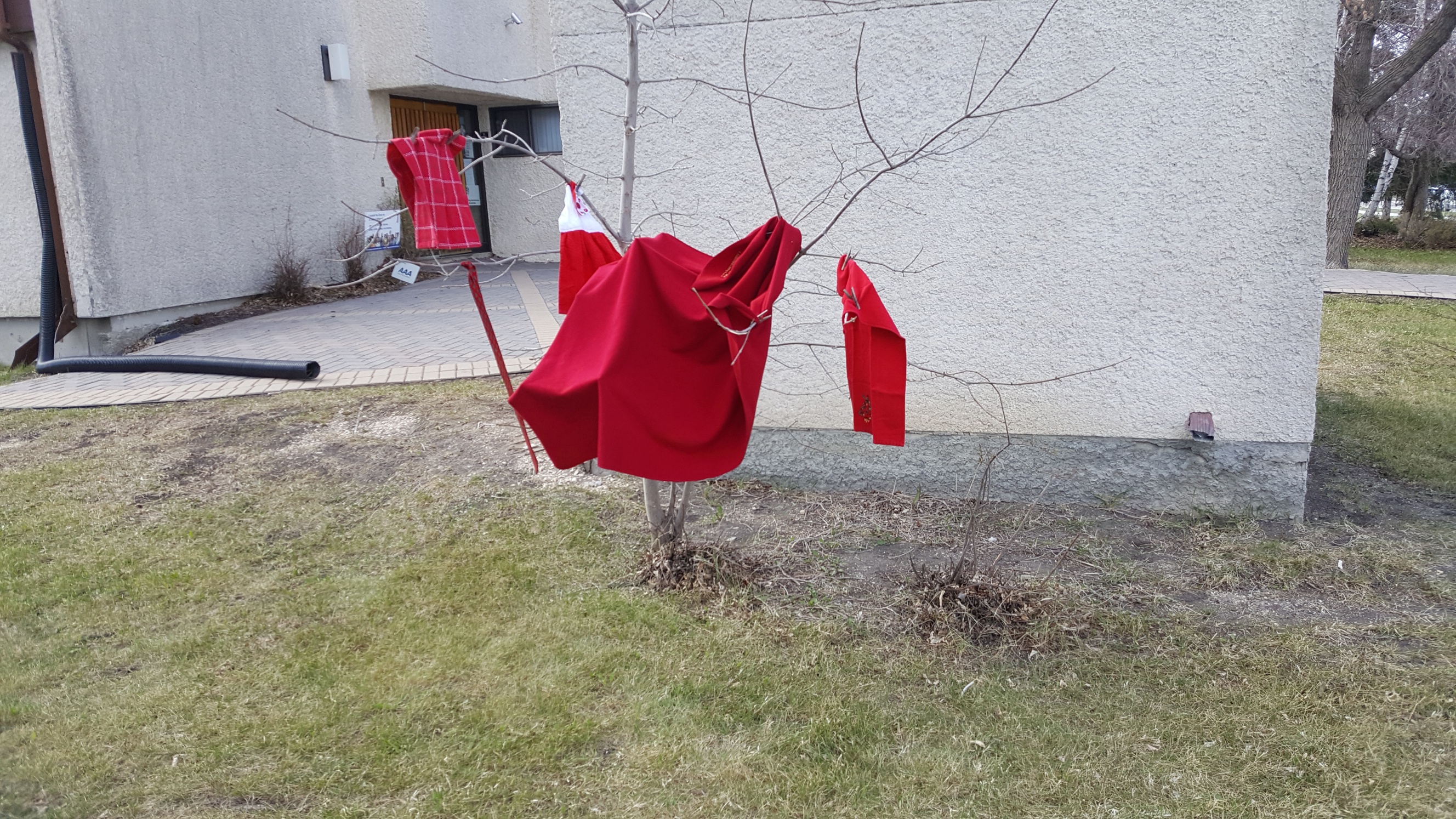 To remember “Red Dress Day” on May 5th, members of the Outreach Committee hung red articles on the trees in the front of the church.