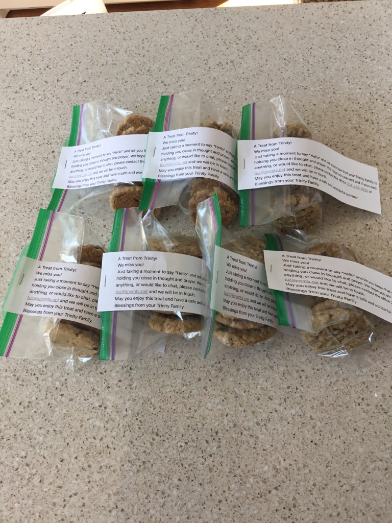 Did you know? The Fellowship Committee made and delivered packages of 6 cookies (2 different kinds) to more than forty Trinity families? These folks reside in care facilities or alone at home and we wanted them to know we think of, pray for and care for them – even when we are apart. Each package included a note “A Treat from Trinity” with our message and followed all COVID health guidelines and safety precautions. This was one example of our faith in action – what a great gift!